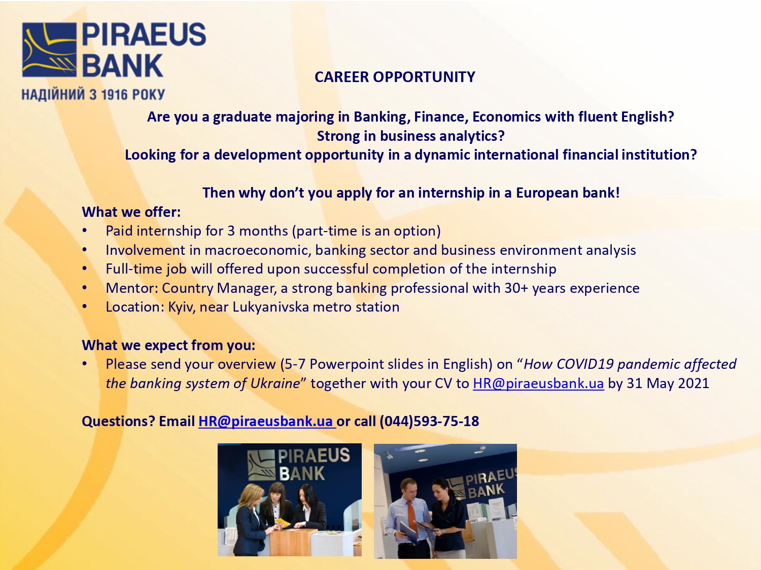 • Будь ласка, надішліть свій огляд (5-7 слайдів Powerpoint англійською мовою) про те, «як пандемія COVID19 вплинула на банківську систему України», разом із своїм резюме на HR@piraeusbank.ua до 31 травня 2021 року.